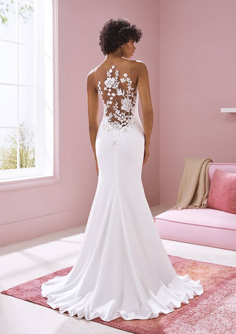 La robe de mariée sirène en crêpe séduit par sa silhouette près du corps et son tombé net. Le crêpe, lisse et légèrement extensible, épouse vos formes avant de s’évaser sous les genoux. Résultat : un look à la fois moderne et très féminin.