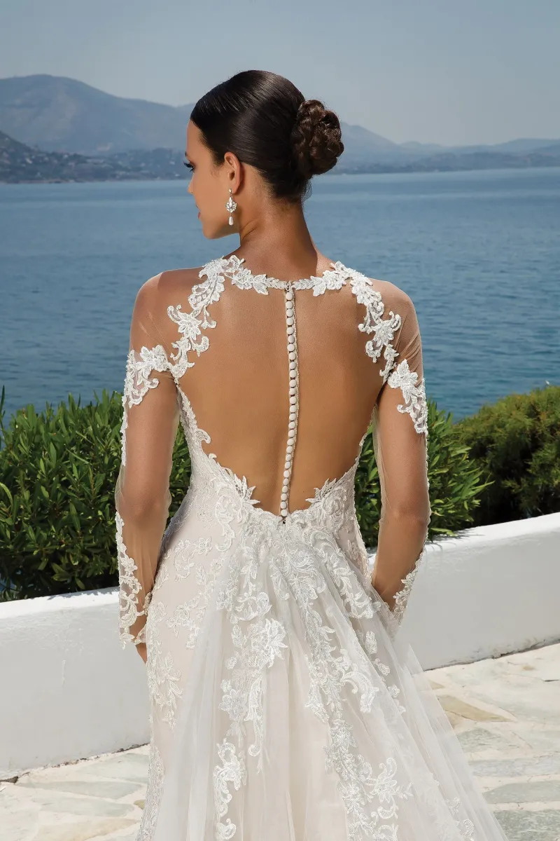 Les dos nus apportent une dimension spectaculaire à ces silhouettes déjà remarquables. Le décolleté dorsal plongeant crée un jeu subtil entre pudeur et audace, parfait pour les mariées contemporaines qui souhaitent affirmer leur personnalité. Les finitions en dentelle perlée ou les applications de strass ajoutent une touche précieuse qui capte magnifiquement la lumière méditerranéenne. Pour optimiser l'effet, privilégiez une lingerie invisible et adaptée qui respecte la coupe ajustée caractéristique du style sirène.