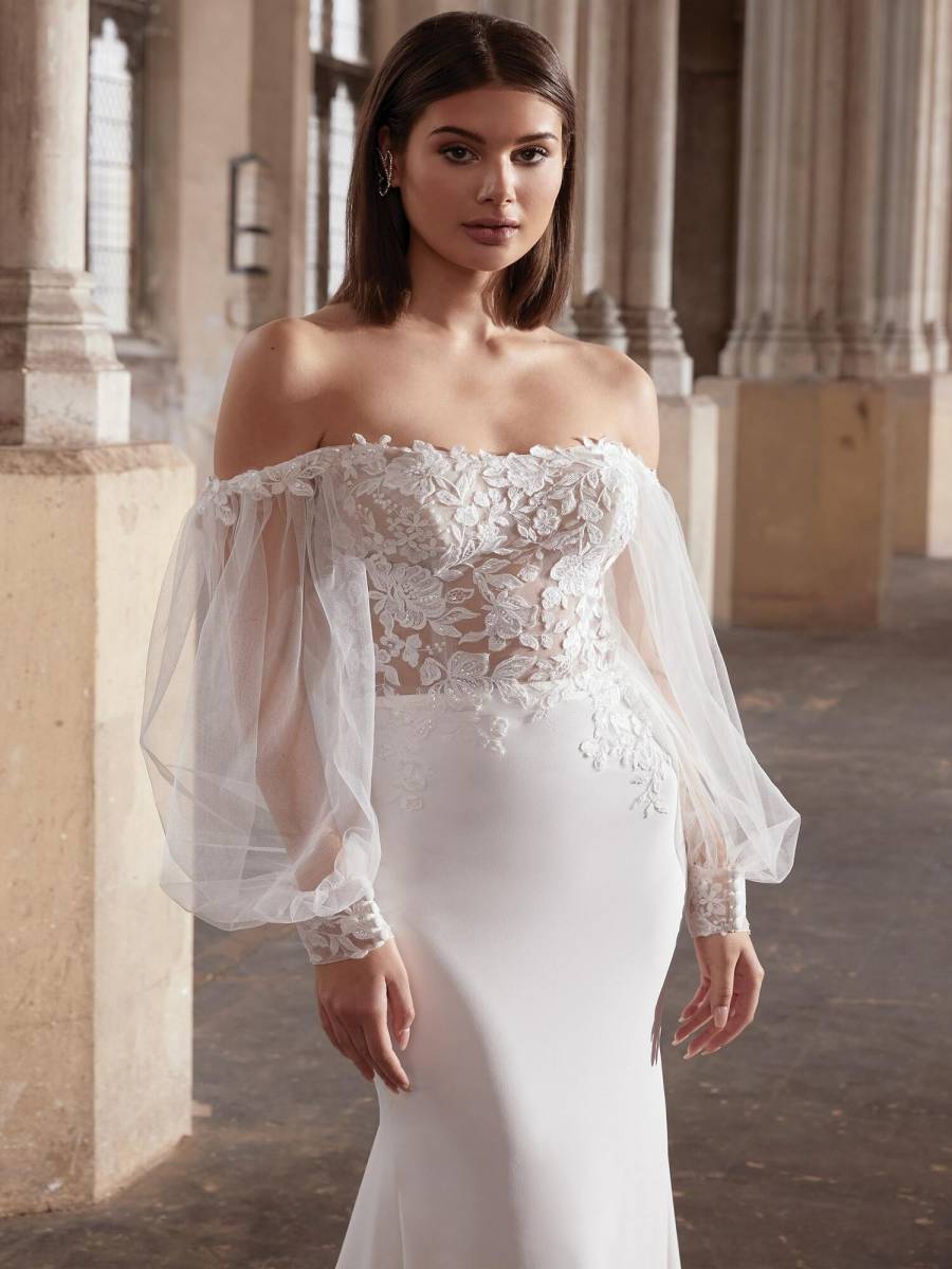 Nos créateurs Justin Alexander et Sincerity Bridal excellent dans l'art des coupes près du corps, proposant des modèles comme le 66360 en dentelle et crêpe ou le 66362 avec ses manches bouffantes tendance.