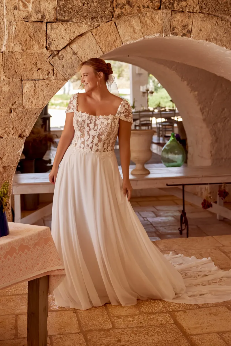 La silhouette princesse sublime toutes les morphologies grâce à son corsage ajusté qui met en valeur la taille et sa jupe ample qui crée un effet spectaculaire. Cette coupe intemporelle convient particulièrement aux mariages romantiques.