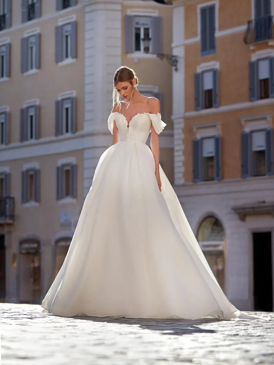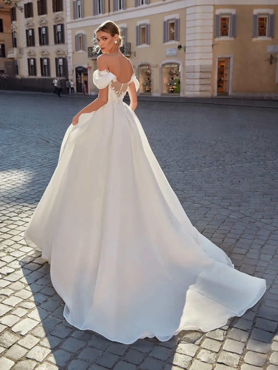 Conçue en organza et mikado, cette robe offre un volume spectaculaire tout en restant fluide et aérienne. Ses manches drapées sur les épaules dénudées, son décolleté sensuel et son dos orné de dentelle perlée apportent une touche raffinée et moderne.