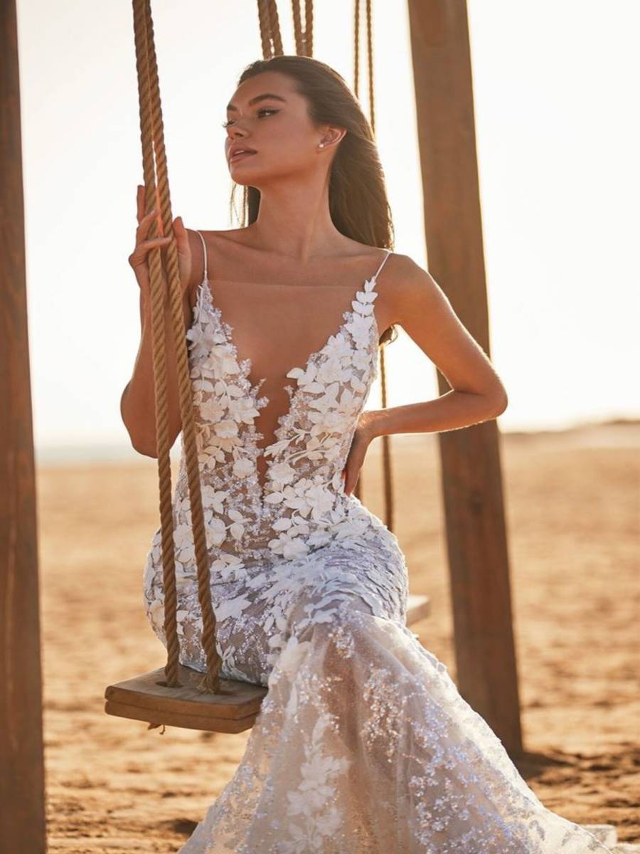 La robe de mariée Djeyn de Milla Nova est parfaite pour celles qui veulent un look spectaculaire et élégant. Sa coupe sirène met en valeur les courbes et son décolleté en V avec dos nu ajoute une touche de glamour. Le tissu, orné de dentelle et de paillettes, brille sous la lumière, et sa longue traîne en tulle crée un effet majestueux.