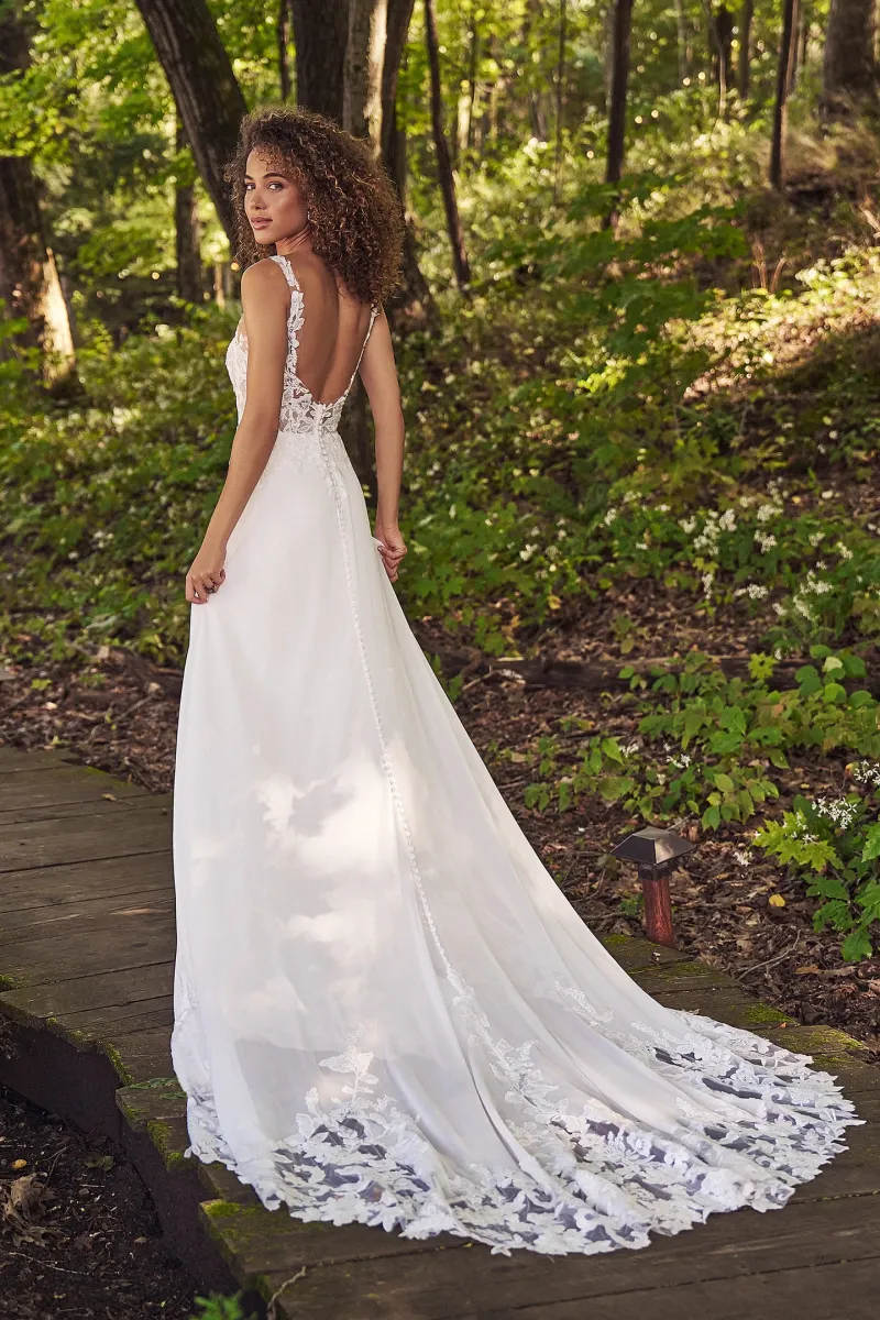 La coupe trapèze de cette robe de mariée se distingue par sa capacité à apporter de la légéreté ai corps de manière élégante et audacieuse.Le tout est complété par un dos en V séduisant, orné de boutons recouverts qui suivent la ligne du dos jusqu’à la traîne.