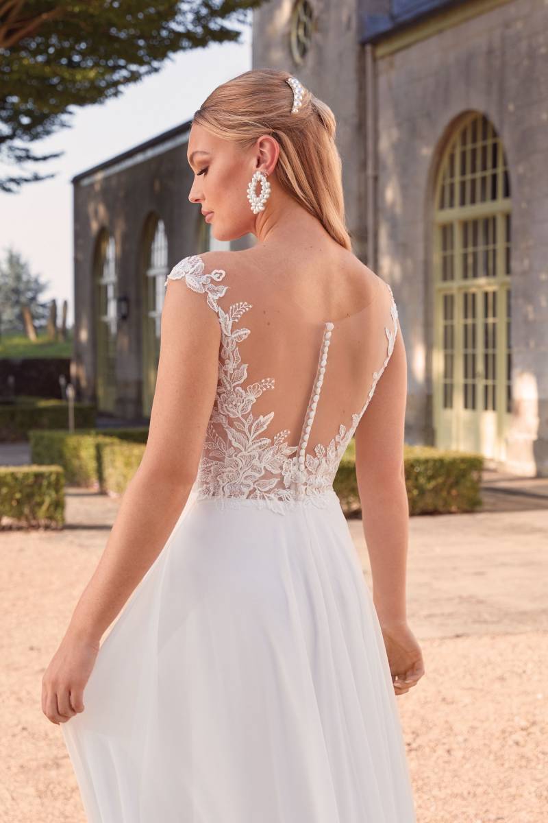 Cette robe convient à toutes les morphologies et sublime la silhouette avec simplicité et grâce. Pour un look harmonieux, privilégiez des accessoires fins et naturels, comme une couronne de fleurs ou un voile léger, et optez pour des chaussures confortables qui accompagneront la légèreté de la mousseline.