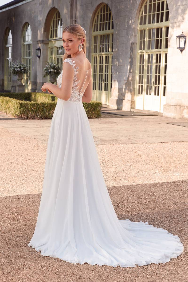 La robe Sincerity 44321 allie une coupe trapèze flatteuse, un mélange de mousseline et de dentelle pour un rendu aérien, et un décolleté illusion Sabrina pour une touche d'élégance moderne.
