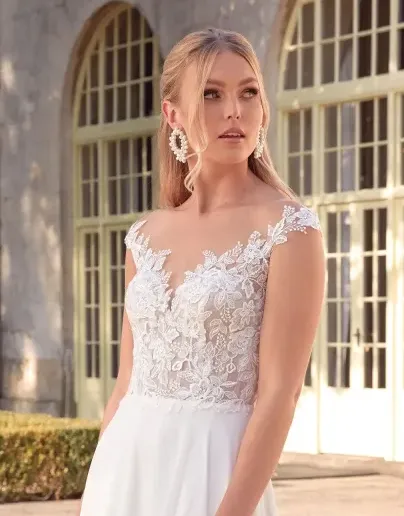 La robe trapèze bohème Sincerity 44321 est parfaite pour les mariées qui recherchent un style à la fois romantique et moderne. Ce modèle, signé Sincerity Bridal du groupe Justin Alexander, allie une coupe trapèze flatteuse à un décolleté illusion Sabrina. Son buste en dentelle délicate, rehaussé de sequins subtils, offre un maintien idéal et une touche de raffinement, tandis que la jupe en mousseline légère assure un tombé fluide et aérien. La traîne chapelle complète la silhouette pour un effet bohème chic, sans jamais alourdir la démarche.