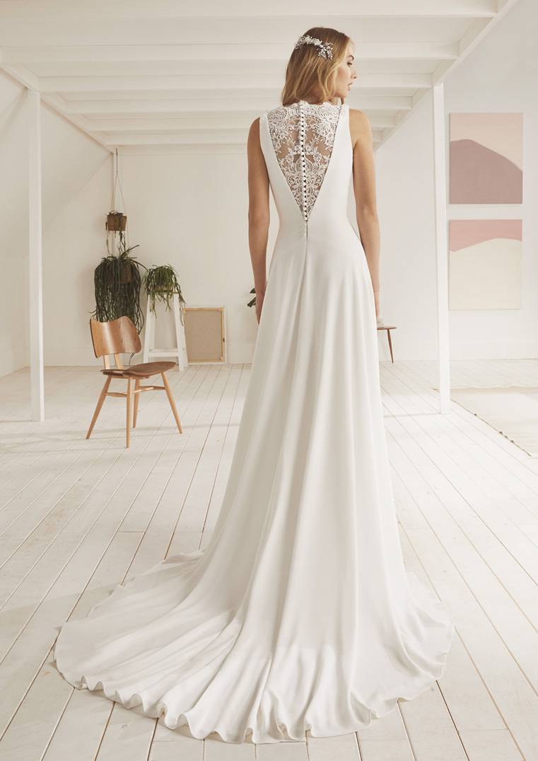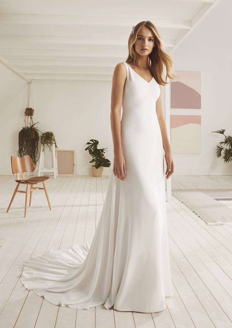 La robe Okawa de White One illustre parfaitement cette approche avec sa forme sirène droite en crêpe Georgette, alliant glamour et simplicité. Son dos en V orné de dentelle et sa traîne élégante créent un équilibre visuel parfait pour les morphologies souhaitant mettre en valeur leurs atouts naturels.
