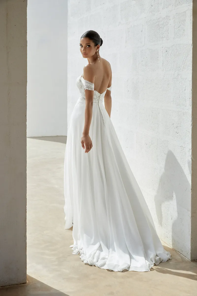 Ce modèle, disponible chez Verona Sposa à Marseille, se distingue par son décolleté cœur qui sublime la silhouette avec une touche de glamour. Conçue pour les mariées rêvant d’un look de princesse, cette robe en tulle et dentelle offre une coupe fluide qui flatte toutes les morphologies. La ligne A, ajustée à la taille et évasée vers le bas, crée une allure gracieuse et aérienne, idéale pour une cérémonie romantique.