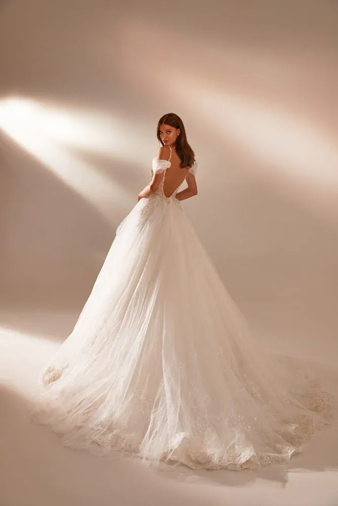 Avec son bustier en dentelle délicate orné de perles et sa jupe volumineuse en tulle, elle offre une allure féerique et moderne. Le corsage semi-transparent met en valeur vos formes, tandis que la jupe ample apporte une touche de magie à chaque mouvement. En ce moment, profitez d’une offre spéciale Golden Sales : cette robe est à seulement 2399€ au lieu de 3199€, une opportunité rare pour une pièce de cette qualité. Prête à dire oui à la robe de vos rêves ? Réservez vite votre essayage pour découvrir ce modèle unique !